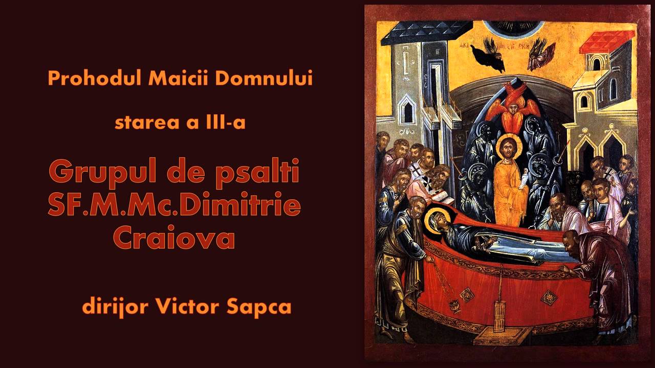 Prohodul domnului audio grupul de psalti ai p. Prohodul adormirii maicii domnului se canta la vecernia praznicului de la 15 august. Prohodul domnului a fost tiparit pentru prima data in tara noastra pe 6 februarie 1836, de catre ieromonahul macarie, prin versuri prohodul domnului.