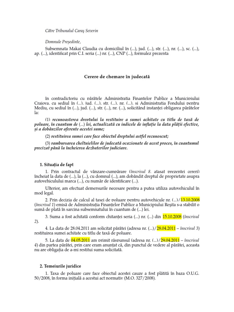 Cererea de restituire, însoţită de documentele mai sus mentionate, se soluţionează de organul fiscal competent, în termenul prevăzut la art. Impactul total al restituirii taxelor pe poluare pentru autovehicule este estimat la aproximativ 3 miliarde de lei, a declarat, miercuri, ministrul mediului, cristiana pașca palmer. Magistraţii propun o procedură administrativă în două etape pentru recuperarea taxei de poluare.