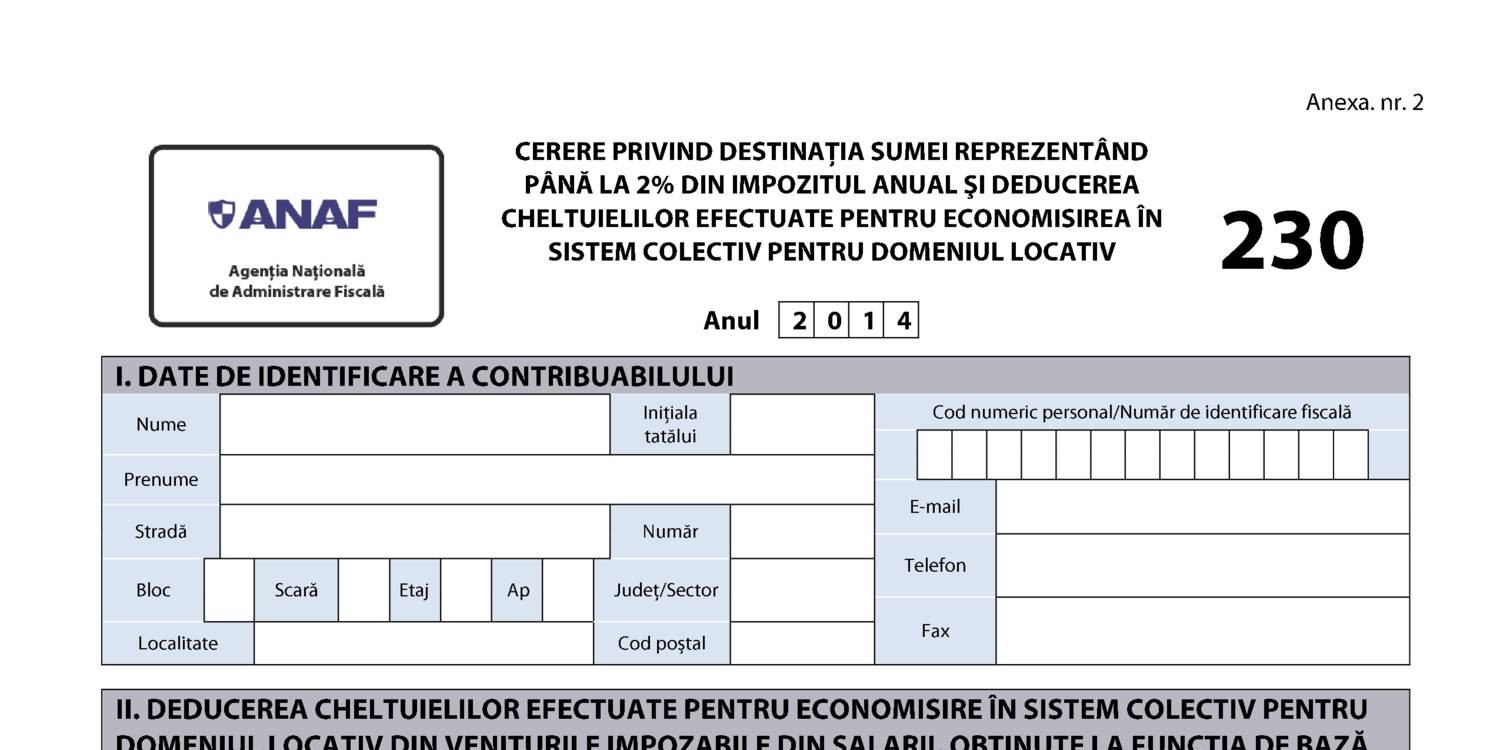 Formular 230 pdf 2019 editabil. Se completează și se depune de. Descarcati gratuit cea mai buna varianta de statute, procuri formular 2 % 2015 impozit anual declaratia 230 pentru anul 2014 destinaţia sumei reprezentând până la 2% din impozitul anual.